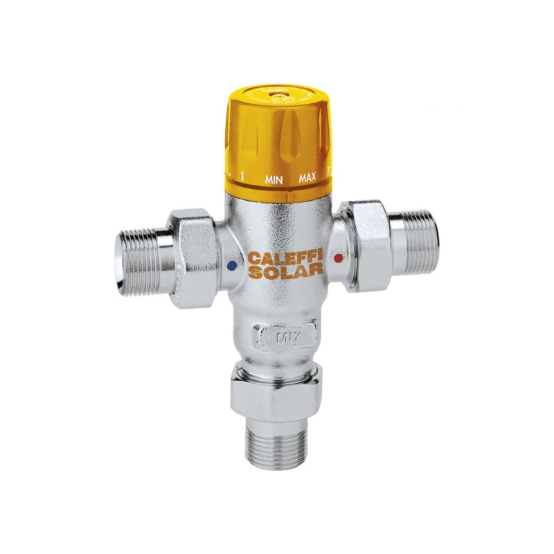Mitigeur thermostatique solaire en laiton chromé, avec clapets intégrés et sécurité anti-brûlure. Construction robuste et anti-calcaire garantissant la stabilité de la température de sortie. Kv : 1,5 m³/h, débit mini 0,3 m³/h, débit maxi 3,7 m³/h.