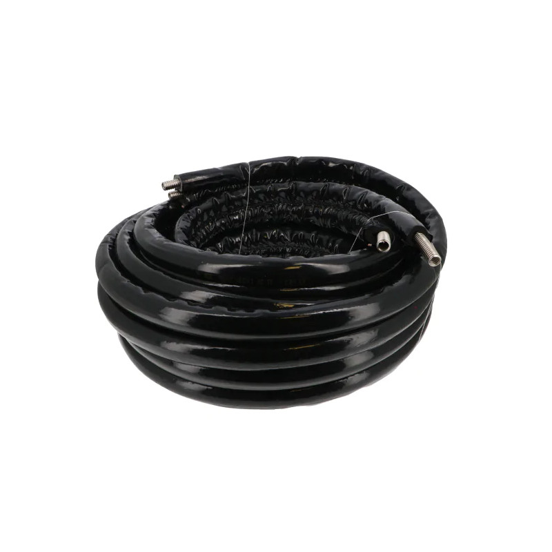 Conduit bi-tube en inox ondulé AISI 316L, pré-isolé par un manchon de 13 mm, livré en couronne de 10 mètres. Intègre un fil de sonde dans une gaine PVC résistante aux UV, rongeurs et humidité. Supporte jusqu’à 16 bar à 20°C et des températures de -270°C à +600°C.