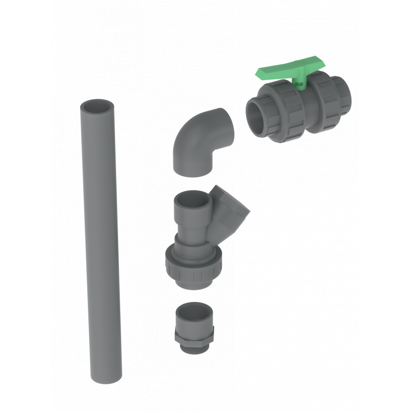 Vous y retrouverez : Un adaptateur mâle-femelle à visser et coller en 3/4" - 20mm, 2m de tube PVC, un clapet à boule avec union en PVC diamètre Ø20, un coude femelle-femelle à coller Ø20, une vanne en PVC de diamètre Ø20 ainsi que de la colle et du téflon pour parfaire l'étanchéité de votre installation.