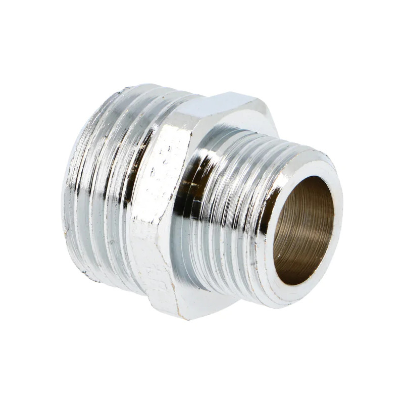 Mamelon réduit en laiton chromé destiné à la réalisation de liaisons vissées droites.