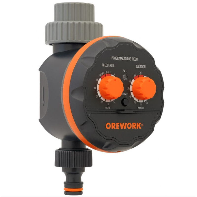 Ce programmateur nez de robinet OREWORK à 2 boutons pilote une sortie d’arrosage. Il fonctionne avec 2 piles LR03 1,5 V (non incluses) et permet de régler une fréquence de 1 h à 7 j et une durée de 1 à 120 min. Fonction DELAY pour démarrage différé de 1 à 12 h.