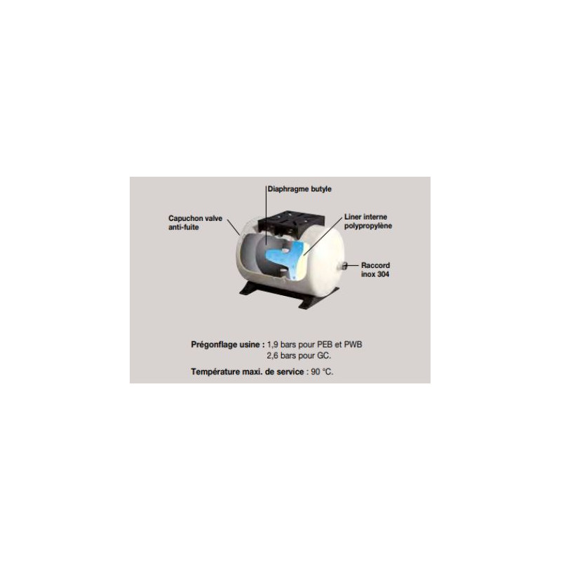- Le Réservoir à diaphragme PWB 60 litres H est un modèle horizontal certifié ACS, idéal pour des installations de surpression domestiques ou d'arrosage. Il automatise les pompes avec un contacteur manométrique et nécessite un gonflage spécifique pour fonctionner. Fiable et performant grâce à son diaphragme en butyle, il offre un entretien réduit et une garantie de 5 ans. Disponible en plusieurs volumes (58 à 450 litres) et orientations (verticale/horizontale).